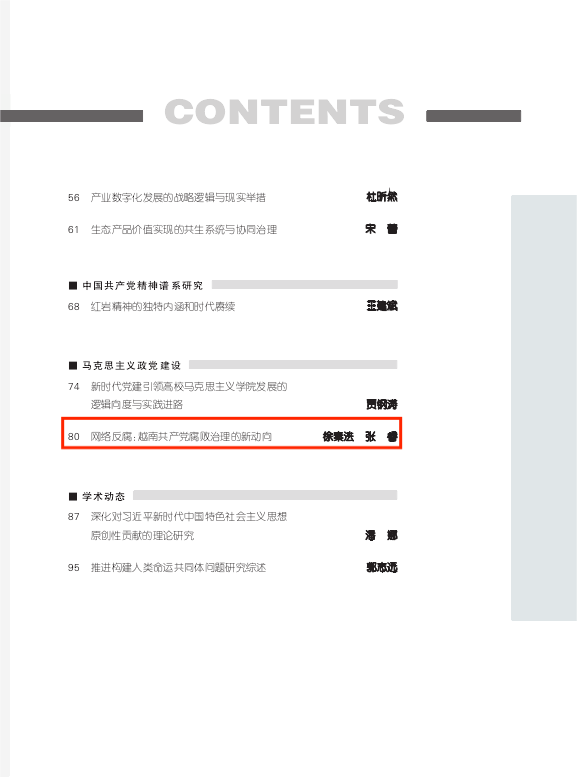 公司徐秦法教授、博士研究生张睿在《理论视野》(2022年第7期)上发表理论文章《网络反腐:越南共产党腐败治理的新动向》。《理论视野》是由中共中央党校主管、中国马克思主义研究基金会主办,经中国原国家新闻出版署批准出版发行的综合性理论刊物。重点研究、宣传马克思主义和马克思主义中国化成果,探讨中国特色社会主义建设中的重大现实和战略问题,并对社会关注的理论热点难点作深度分析。