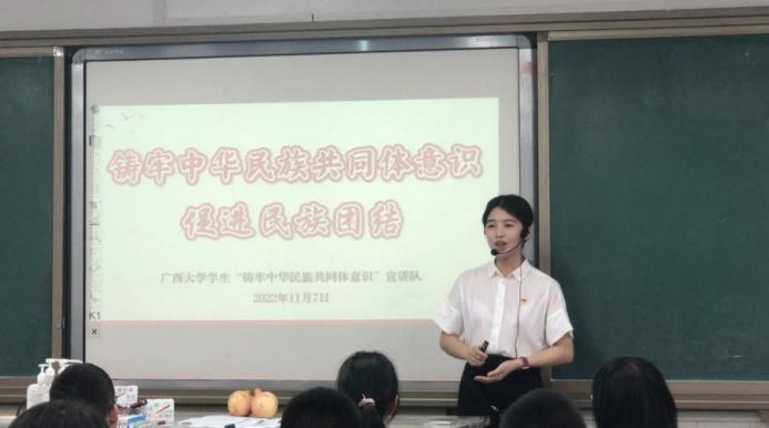 以“石榴”为媒,用微宣讲搭建起中员工思政课堂。“我们此次微宣讲不是单纯的理论灌输,而是从中员工感兴趣的内容入手,结合广西民族团结进步工作的成就,员工们自己的亲身见闻,用‘石榴’这个具体的物品为媒介,开展微宣讲,以更好地理解党的二十大报告中‘以铸牢中华民族共同体意识为主线,全面推进民族团结进步事业’。”员工宣讲队指导教师陆秀红教授谈到。