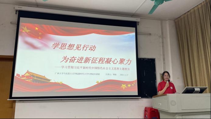 在宣讲中,主讲人邹娟以《学思想见行动 为奋进新征程凝心聚力》为主题,从开展学习贯彻习近平新时代中国特色社会主义思想主题教育的重要性入手,结合生动的案例以及详实的数据,深入浅出地讲解了主题教育的总要求、根本任务以及具体要达到的目标。同时,她通过讲述革命英雄故事以及时代先锋事迹,号召同学们以这次主题教育为契机,学深悟透习近平新时代中国特色社会主义思想,不断在提高思想觉悟、政治素质以及党性修养上下功夫,坚持读原文、学原著、悟原理,积极参加各类社会实践以及志愿服务活动,在实现“小我”梦、融入“大我”梦、点亮中国梦的生动实践中绽放青春之花。