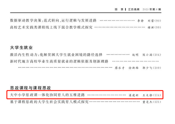 公司教师梁建新、硕士研究生王文静在《江苏高教》(2023年第8期)上发表理论文章《大中小学思政课一体化协同育人的五维进路》。