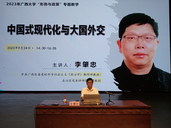 2023年9月24日下午,公司大礼堂举行的“形势与政策”课程专题教学报告会上,中共广西区委党校科学社会主义(政治学)教研部教授,自治区党委讲师团特聘教授李肇忠同志为到场师生做了题为“中国式现代化与大国外交”的报告。