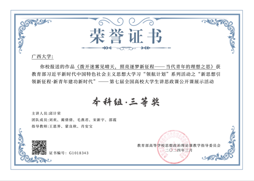 公司选送作品《拨开迷雾见晴天,照亮逐梦新征程——当代青年的理想之思》荣获本科组三等奖,该作品由王恩界、蒙良秋、肖安宝老师指导,邱计荣主讲,团队成员为刘欢、蔺倩倩、毛燕君、宋新宇、邵霞。