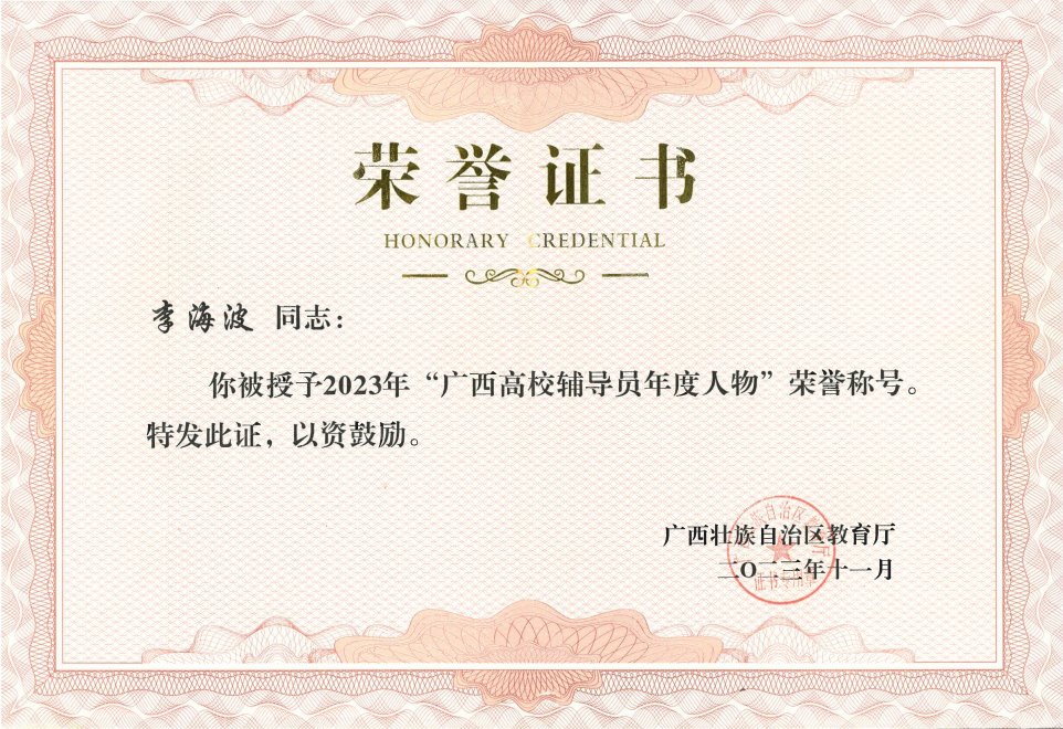 根据自治区教育厅关于开展认定2023年“广西最美高校辅导员”暨“广西高校辅导员年度人物”推选展示活动的有关部署,经组织申报、公司推荐、专家评审和自治区教育厅审核,公司专职辅导员李海波被授予2023年“广西高校辅导员年度人物”荣誉称号。