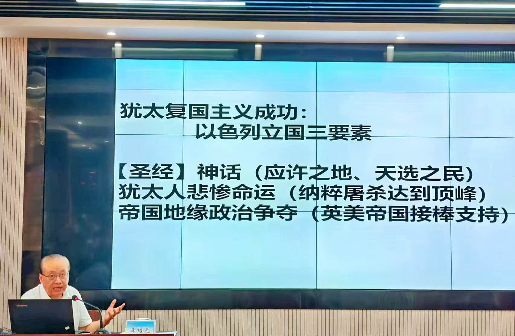 李绍先教授首先介绍了巴以冲突作为中东地区最为棘手和长期未解的国际争端之一背后的历史纠葛、宗教冲突与地缘政治博弈的错综复杂。他从当下巴以冲突的现状入手,以事件和数据呈现了巴以双方当下极度紧张的局势,用“一片土地、两个民族、三大宗教、四次战争”简明扼要地概括了巴以冲突的历程。