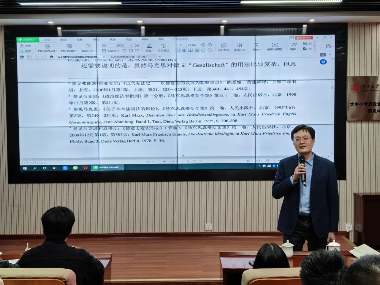 讲座中,徐长福教授对马克思《<政治经济学批判>序言》中的社会结构论进行了深入剖析,并提出了与传统解读不同的观点。他强调,尽管马克思的社会结构论常被解读为“生产力→生产关系-经济基础→上层建筑”的三层结构,但实际上马克思也在《序言》中的同一处论述中运用了四重生活的概念来呈现社会结构的多层级性。