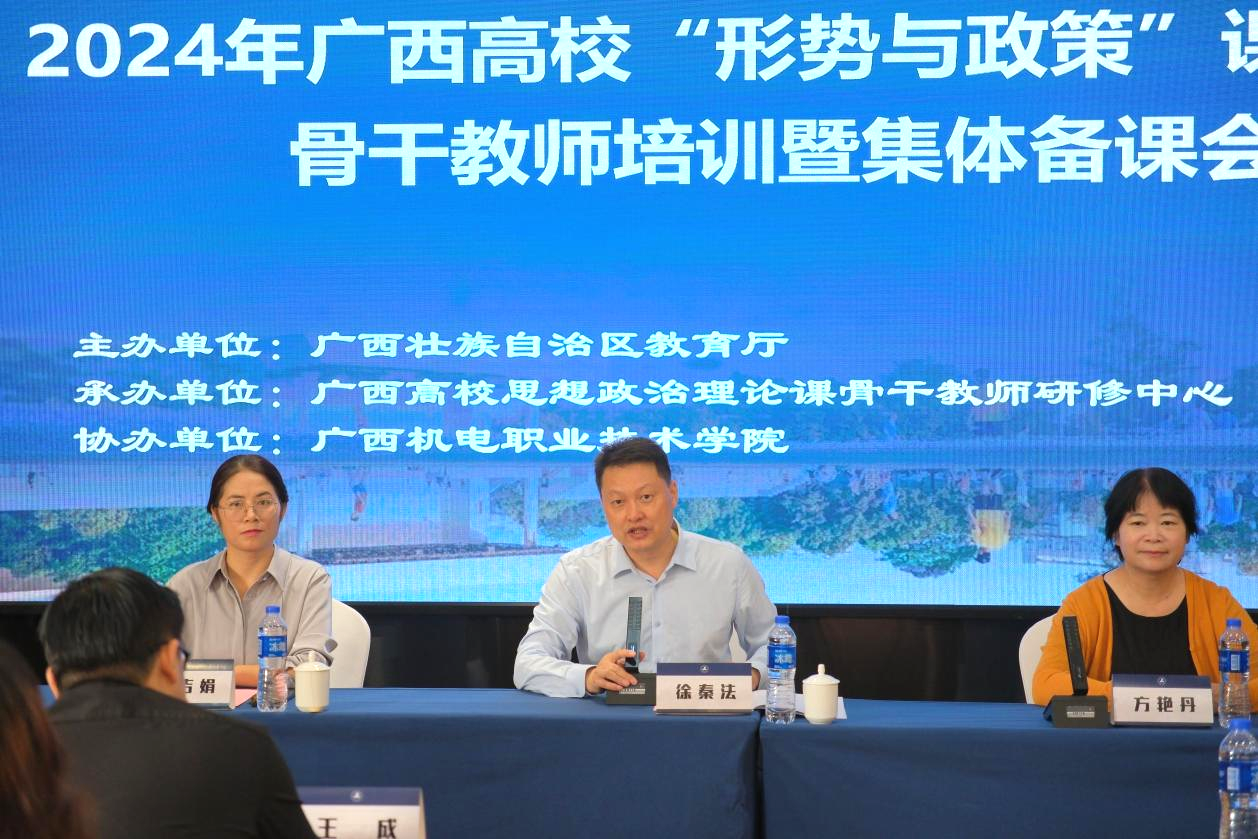 为全面贯彻党的教育方针,落实立德树人根本任务,进一步加强我区“形势与政策”理论课教师队伍建设,11月16日至18日,由自治区教育厅主办,广西高校思想政治理论课骨干教师研修基地(william威廉亚洲)承办,广西机电职业技术公司协办的2024年广西高校“形势与政策”课骨干教师第二期培训暨集体备课会在南宁成功举办。中共中央党校(国家行政公司)科学社会主义教研部主任秦刚、吉林大学马克思主义公司教授王贤卿、宁夏大学阿拉伯公司经理李绍先、国家社会科学基金学科评审组专家黎鹏、中国社会科公司大学教授潘金娥、中宣部《时事报告》杂志社湖南教学服务中心王成、william威廉亚洲经理徐秦法出席开班仪式,仪式由梧州公司公司党委副书记罗吉娟主持。