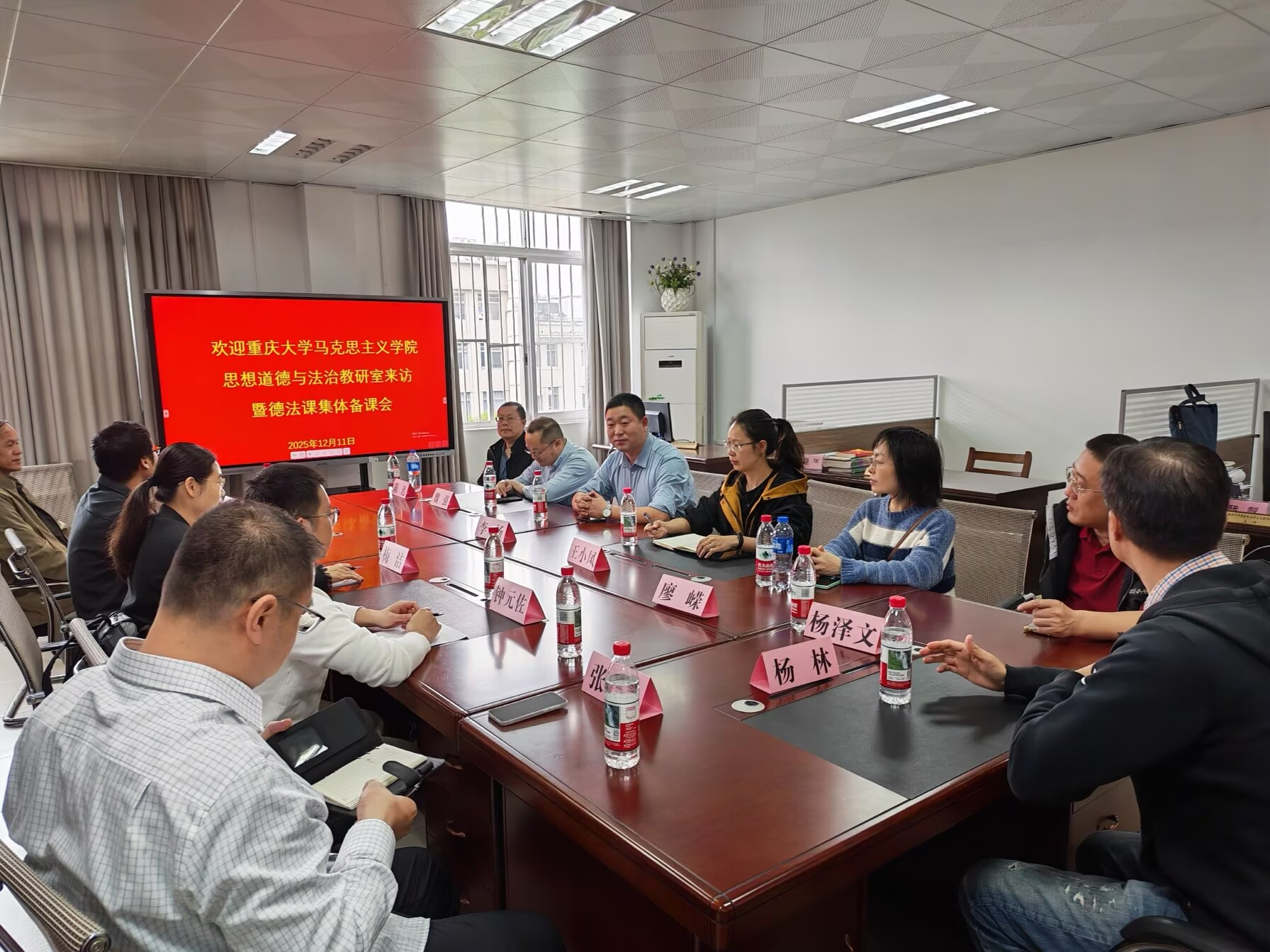 2025年12月11日下午,重庆大学马克思主义公司思想道德与法治教研部魏强教授一行到公司思想道德与法治教研部进行调研,双方就“思想道德与法治”课程建设与教学改革进行了集体备课。公司思想道德与法治教研部主任梅洁主持座谈会。