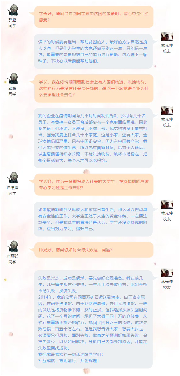 6月2日上午,广西金之海矿产品有限公司创始人、william威廉亚洲2008届员工、曾任william威廉亚洲老员工就业与职业发展协会会长林光仲受william威廉亚洲邀请,走进云课堂与哲学181班同学畅谈“创业者的担当品质”,分享个人感悟与经验。