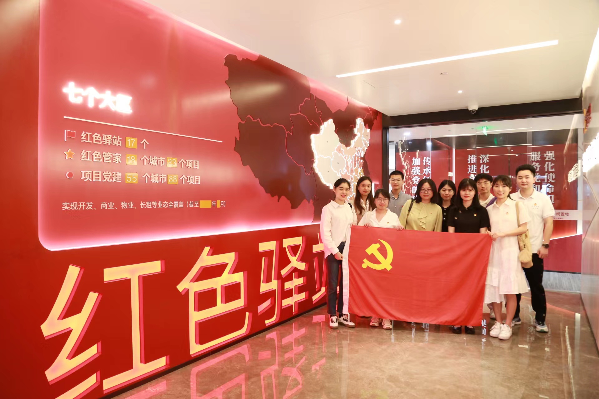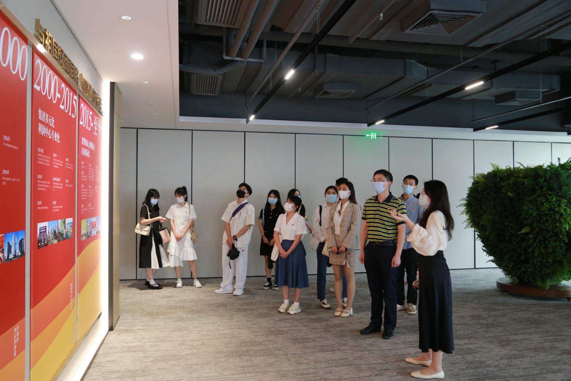 下午3点,公司交流团队在广西华润大厦48楼参观红色驿站党团史展览。该展览设有不忘初心厅、“红湾”主题阅读体验区、中国精神谱系长廊、华润党建文化展示区、党群文化展示区及健身房等区域,师生们在参观中沉浸式体验华润党建文化。