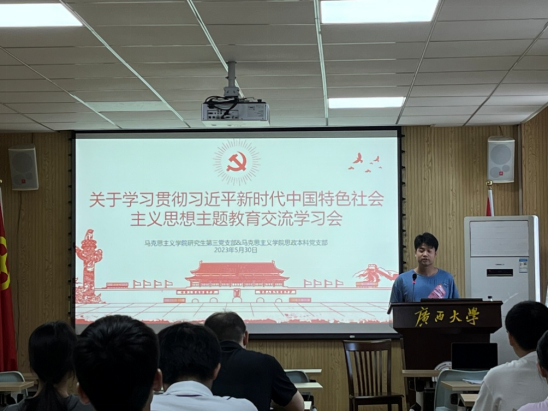 会上,研究生第三党支部宣传委员田哲瑞同志、思政本科党支部党员余汶罡同志分别根据自身学习体会进行了题为《以斗争精神迎接挑战,以奋进拼搏开辟未来》和《习近平外交思想》的宣讲。