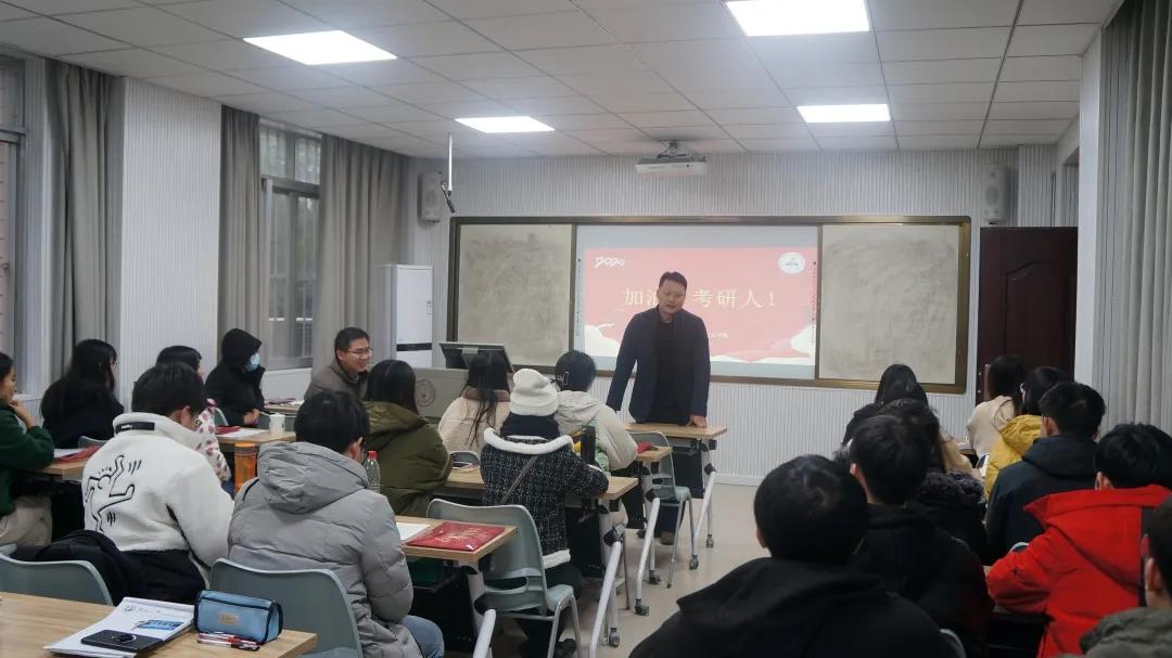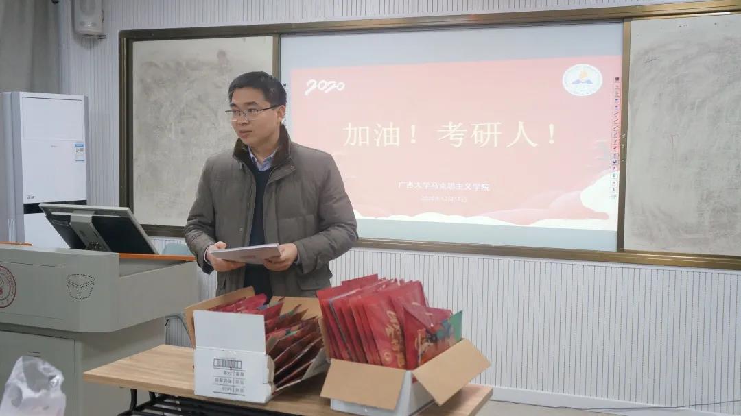 会上,徐经理发表了热情洋溢的动员讲话。他为同学们传授答题技巧,答题思路要清晰,观点要鲜明,作答过程中不要着急,写字要规整。他特别强调要诚信考试。他还用自己当年的考研经历和所执教员工的真实案例鼓舞同学们要坚定信心,积极备考,坚持到底,马到功成。
