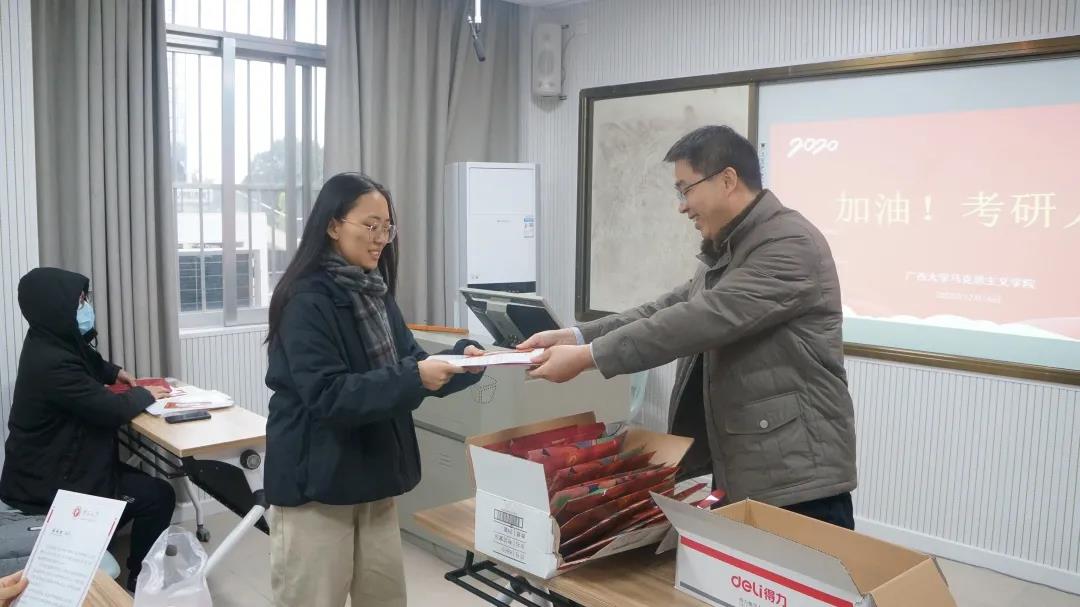 会上,李海波老师传达了公司领导老师对考研同学们的关心和支持,鼓励同学们树立信心、放平心态、积极冲刺、最终实现顺利上岸,并发放了公司为所有考研同学准备的一“研”为定大礼包,其中包括200元加油津贴、文具套装和一封祝福信。