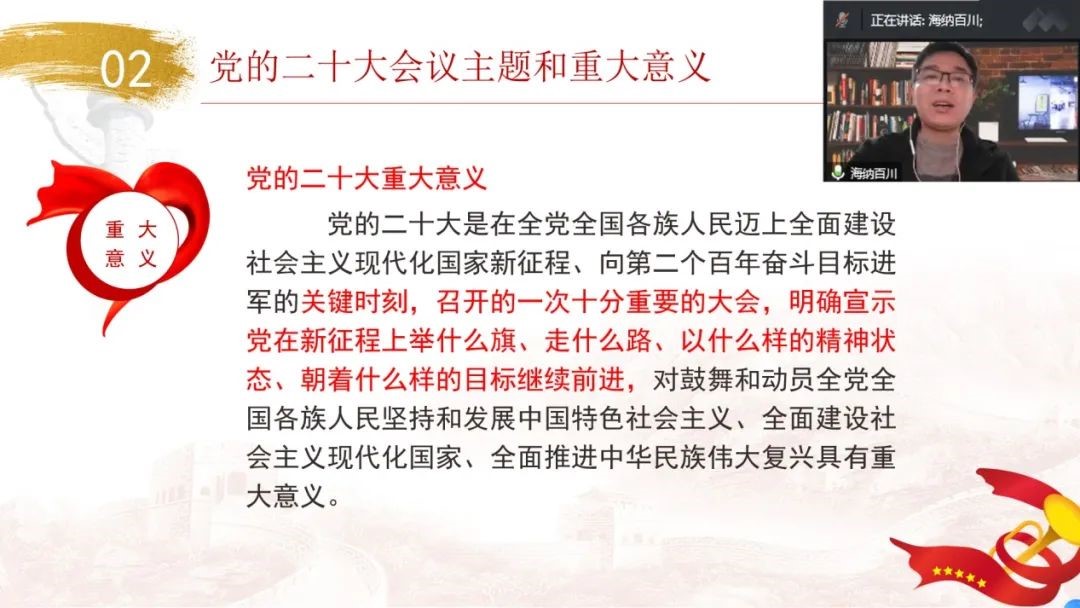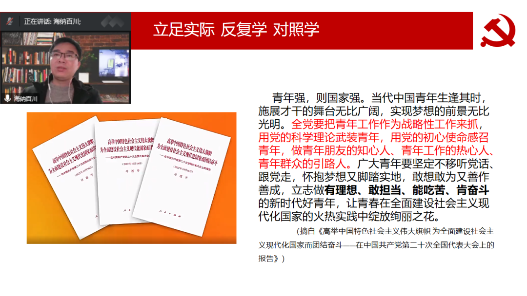 在宣讲中,李海波老师以《五个牢牢把握——学习贯彻党的二十大精神的“金钥匙”》为题,向同学们详细介绍了党的二十大的主题和重要意义,系统阐释了党的二十大报告中的新观点、新论断、新思想,重点讲解了“五个牢牢把握”的内涵要求。他强调,同学们要把学习党的二十大精神作为一项重大政治任务来抓,切实做到学深悟透、入脑入心;要原原本本学、立足实际学、反复对照学,做到“书读百遍,其意自现”,把党的二十大精神吃准吃透。最后,他勉励同学们以党的二十大精神为指引,牢记习近平总书记对青年的殷殷嘱托,“撸起袖子加油干”,为全面推进中华民族伟大复兴而团结奋斗!